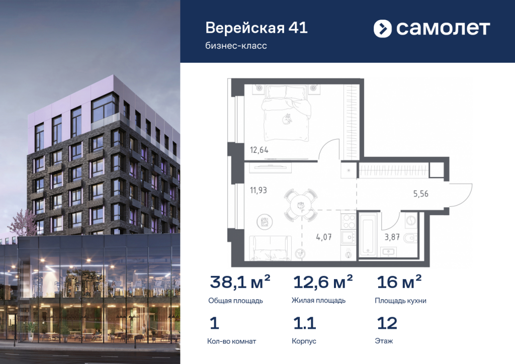Строим кварталы для жизни с заботой о будущем. Предлагается 1-комнатная квартира бизнес-класса 38,07 кв.м в корпусе 1.1 на 12 этаже, в «Верейская 41» Квартира без отделки. Доступность опции «отделка» и возможность комплектации мебелью и декором уточняйте у застройщика. Приобрести квартиру возможно по специальным акциям от застройщика, с текущими условиями акций можно ознакомиться в блоке «Акций». Цена динамическая и может отличаться, уточняйте актуальность у застройщика. «Верейская 41» — проект бизнес-класса рядом с «Долиной реки Сетунь» и Кутузовским проспектом. Из панорамных окон открываются виды на природный заказник. Комплекс включает 4 урбан-блока высотой до 14 этажей, зеленые террасы, сад с навесами из растений, спортивные и игровые площадки, плоскостной и 2 подземных паркинга. Планировки сдаются с дизайнерской отделкой в природных тонах.