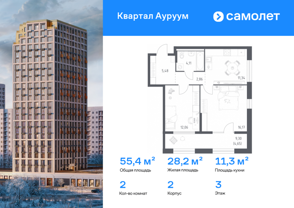 Строим кварталы для жизни с заботой о будущем. Предлагается 2-комнатная квартира бизнес-класса 55,4 кв.м в корпусе 2 на 3 этаже, в ЖК «Квартал Ауруум» Квартира с предчистовой отделкой. Доступность дополнительных опций уточняйте у застройщика. Приобрести квартиру возможно по специальным акциям от застройщика, с текущими условиями акций можно ознакомиться в блоке «Акций». Цена динамическая и может отличаться, уточняйте актуальность у застройщика. «Квартал Ауруум» — это море зелени под вашими окнами и жизнь в уютном квартале с собственной инфраструктурой. До центра города — всего 15 минут на авто. Жилой квартал находится в развитом районе, где все необходимое рядом — свой детский сад, магазины, кафе и школа — через дорогу. 4 разновысотных корпуса, от 14 до 31 этажа, дарят ощущение простора и много естественного света в квартирах. Для неспешных прогулок - приватный двор-сад или Основинский парк у подножия комплекса. Для авто — подземный паркинг. Все квартиры с предчистовой отделкой.