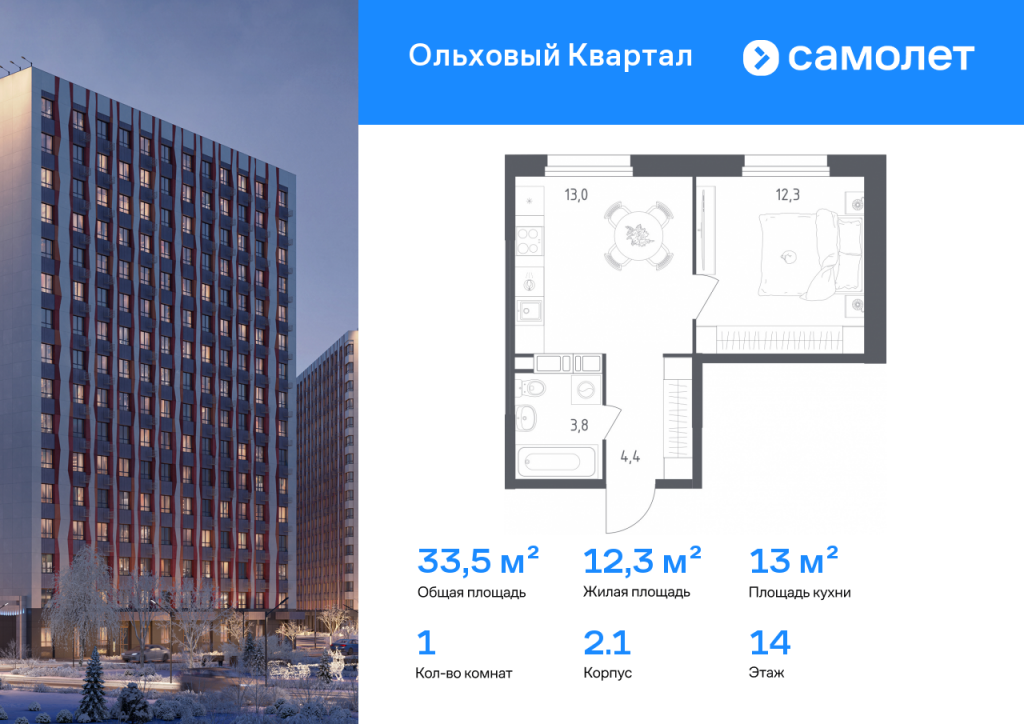Строим кварталы для жизни с заботой о будущем. Предлагается 1-комнатная квартира комфорт-класса 33,5 кв.м в корпусе 2.1 на 14 этаже, в ЖК «Ольховый Квартал» Квартира без отделки. Доступность опции «отделка» и возможность комплектации мебелью и декором уточняйте у застройщика. Приобрести квартиру возможно по специальным акциям от застройщика, с текущими условиями акций можно ознакомиться в блоке «Акций». Цена динамическая и может отличаться, уточняйте актуальность у застройщика. Жилой комплекс «Ольховый Квартал» — проект комфорт-класса в Новой Москве, в пешей доступности от 3 станций метро: «Ольховая», «Прокшино» и «Коммунарка» новой Троицкой ветки. Это 3 дома высотой 16 этажей с приватными зелеными дворами. Территория квартала граничит с зеленой рощей, а через дорогу — лесопарк для ежедневных прогулок. Рядом 7 фитнес-клубов, магазины, кафе, медицинские центры, а также школы и детские сады. Пространства для тихого отдыха будут огорожены живыми изгородями. Также высадят ель, которая создаст новогоднее настроение зимой. Предусмотрены современные детские площадки для ребят всех возрастов, воркаут-зона, площадка для выгула и тренировки собак. Любители спортивных игр оценят баскетбольную площадку и столы для настольного тенниса. Светлые фасады гармонируют с окружающей природой. Облицовочный материал — фиброцементные панели. Вечером фасады украшает архитектурная подсветка.