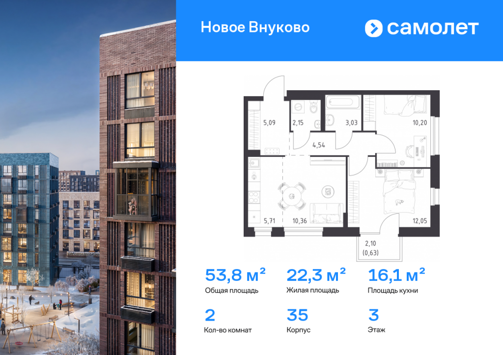 Строим кварталы для жизни с заботой о будущем. Предлагается 2-комнатная квартира комфорт-класса 53,76 кв.м в корпусе 35 на 3 этаже, в ЖК «Новое Внуково» Квартира без отделки. Доступность опции «отделка» и возможность комплектации мебелью и декором уточняйте у застройщика. Приобрести квартиру возможно по специальным акциям от застройщика, с текущими условиями акций можно ознакомиться в блоке «Акций». Цена динамическая и может отличаться, уточняйте актуальность у застройщика. «Новое Внуково» — это жилой комплекс в Новой Москве, у подножия берега реки Незнайка. Поблизости — живописные места для прогулок: народный парк «Ручеек», усадьба Старо-Никольское, Валуевский и Ульяновский лесопарки. Часть домов сдана и внутри района уже открыт детсад с бассейном, а в ближайшее время откроются еще 3 детсада, 2 школы и поликлиника. На территории проекта будет построен первый в России Центр Российской Федерации Баскетбола, где будут площадки с трибунами, тренажерный зал, кафе и конференц-зал. Дворы-парки закрыты от машин и посторонних. На территории — прогулочный маршрут вдоль реки Незнайка и набережная с шезлонгами и качелями для отдыха. Также здесь появится плейхаб «Незнайка на Луне», площадь для мероприятий с сухим фонтаном, летним кинотеатром и кафе. В жилом комплексе — монолитные дома высотой от 6 до 14 этажей. Фасады облицованы кирпичом природных оттенков.