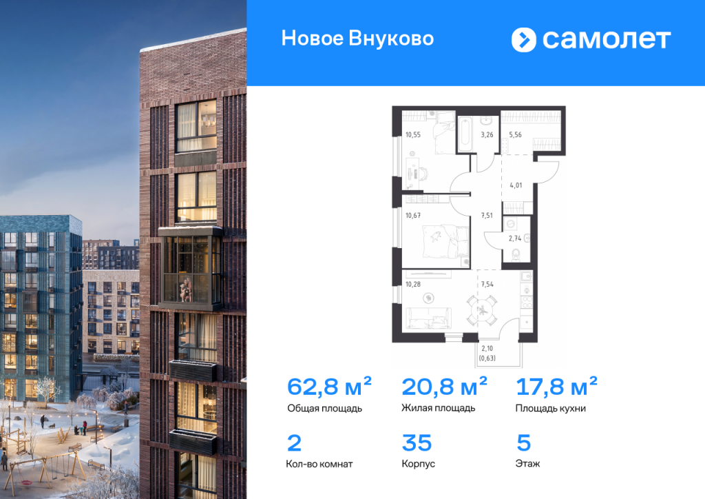 Строим кварталы для жизни с заботой о будущем. Предлагается 2-комнатная квартира комфорт-класса 62,75 кв.м в корпусе 35 на 5 этаже, в ЖК «Новое Внуково» Квартира без отделки. Доступность опции «отделка» и возможность комплектации мебелью и декором уточняйте у застройщика. Приобрести квартиру возможно по специальным акциям от застройщика, с текущими условиями акций можно ознакомиться в блоке «Акций». Цена динамическая и может отличаться, уточняйте актуальность у застройщика. «Новое Внуково» — это жилой комплекс в Новой Москве, у подножия берега реки Незнайка. Поблизости — живописные места для прогулок: народный парк «Ручеек», усадьба Старо-Никольское, Валуевский и Ульяновский лесопарки. Часть домов сдана и внутри района уже открыт детсад с бассейном, а в ближайшее время откроются еще 3 детсада, 2 школы и поликлиника. На территории проекта будет построен первый в России Центр Российской Федерации Баскетбола, где будут площадки с трибунами, тренажерный зал, кафе и конференц-зал. Дворы-парки закрыты от машин и посторонних. На территории — прогулочный маршрут вдоль реки Незнайка и набережная с шезлонгами и качелями для отдыха. Также здесь появится плейхаб «Незнайка на Луне», площадь для мероприятий с сухим фонтаном, летним кинотеатром и кафе. В жилом комплексе — монолитные дома высотой от 6 до 14 этажей. Фасады облицованы кирпичом природных оттенков.