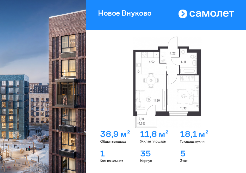 Строим кварталы для жизни с заботой о будущем. Предлагается 1-комнатная квартира комфорт-класса 38,85 кв.м в корпусе 35 на 5 этаже, в ЖК «Новое Внуково» Квартира без отделки. Доступность опции «отделка» и возможность комплектации мебелью и декором уточняйте у застройщика. Приобрести квартиру возможно по специальным акциям от застройщика, с текущими условиями акций можно ознакомиться в блоке «Акций». Цена динамическая и может отличаться, уточняйте актуальность у застройщика. «Новое Внуково» — это жилой комплекс в Новой Москве, у подножия берега реки Незнайка. Поблизости — живописные места для прогулок: народный парк «Ручеек», усадьба Старо-Никольское, Валуевский и Ульяновский лесопарки. Часть домов сдана и внутри района уже открыт детсад с бассейном, а в ближайшее время откроются еще 3 детсада, 2 школы и поликлиника. На территории проекта будет построен первый в России Центр Российской Федерации Баскетбола, где будут площадки с трибунами, тренажерный зал, кафе и конференц-зал. Дворы-парки закрыты от машин и посторонних. На территории — прогулочный маршрут вдоль реки Незнайка и набережная с шезлонгами и качелями для отдыха. Также здесь появится плейхаб «Незнайка на Луне», площадь для мероприятий с сухим фонтаном, летним кинотеатром и кафе. В жилом комплексе — монолитные дома высотой от 6 до 14 этажей. Фасады облицованы кирпичом природных оттенков.