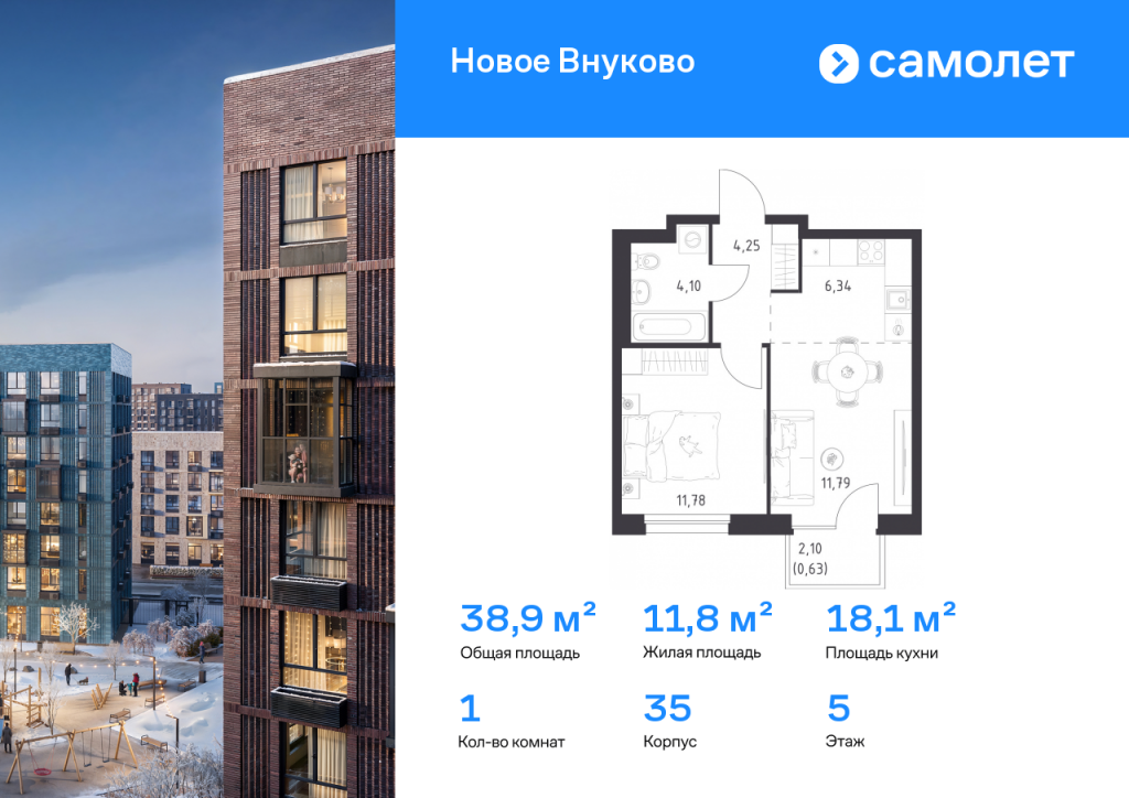 Строим кварталы для жизни с заботой о будущем. Предлагается 1-комнатная квартира комфорт-класса 38,89 кв.м в корпусе 35 на 5 этаже, в ЖК «Новое Внуково» Квартира без отделки. Доступность опции «отделка» и возможность комплектации мебелью и декором уточняйте у застройщика. Приобрести квартиру возможно по специальным акциям от застройщика, с текущими условиями акций можно ознакомиться в блоке «Акций». Цена динамическая и может отличаться, уточняйте актуальность у застройщика. «Новое Внуково» — это жилой комплекс в Новой Москве, у подножия берега реки Незнайка. Поблизости — живописные места для прогулок: народный парк «Ручеек», усадьба Старо-Никольское, Валуевский и Ульяновский лесопарки. Часть домов сдана и внутри района уже открыт детсад с бассейном, а в ближайшее время откроются еще 3 детсада, 2 школы и поликлиника. На территории проекта будет построен первый в России Центр Российской Федерации Баскетбола, где будут площадки с трибунами, тренажерный зал, кафе и конференц-зал. Дворы-парки закрыты от машин и посторонних. На территории — прогулочный маршрут вдоль реки Незнайка и набережная с шезлонгами и качелями для отдыха. Также здесь появится плейхаб «Незнайка на Луне», площадь для мероприятий с сухим фонтаном, летним кинотеатром и кафе. В жилом комплексе — монолитные дома высотой от 6 до 14 этажей. Фасады облицованы кирпичом природных оттенков.