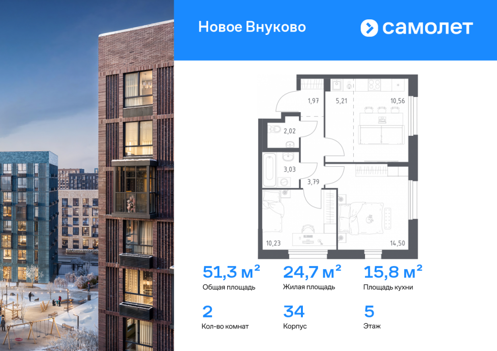 Строим кварталы для жизни с заботой о будущем. Предлагается 2-комнатная квартира комфорт-класса 51,31 кв.м в корпусе 34 на 5 этаже, в ЖК «Новое Внуково» Квартира с чистовой отделкой. Доступность дополнительных опций уточняйте у застройщика. Приобрести квартиру возможно по специальным акциям от застройщика, с текущими условиями акций можно ознакомиться в блоке «Акций». Цена динамическая и может отличаться, уточняйте актуальность у застройщика. «Новое Внуково» — это жилой комплекс в Новой Москве, у подножия берега реки Незнайка. Поблизости — живописные места для прогулок: народный парк «Ручеек», усадьба Старо-Никольское, Валуевский и Ульяновский лесопарки. Часть домов сдана и внутри района уже открыт детсад с бассейном, а в ближайшее время откроются еще 3 детсада, 2 школы и поликлиника. На территории проекта будет построен первый в России Центр Российской Федерации Баскетбола, где будут площадки с трибунами, тренажерный зал, кафе и конференц-зал. Дворы-парки закрыты от машин и посторонних. На территории — прогулочный маршрут вдоль реки Незнайка и набережная с шезлонгами и качелями для отдыха. Также здесь появится плейхаб «Незнайка на Луне», площадь для мероприятий с сухим фонтаном, летним кинотеатром и кафе. В жилом комплексе — монолитные дома высотой от 6 до 14 этажей. Фасады облицованы кирпичом природных оттенков.