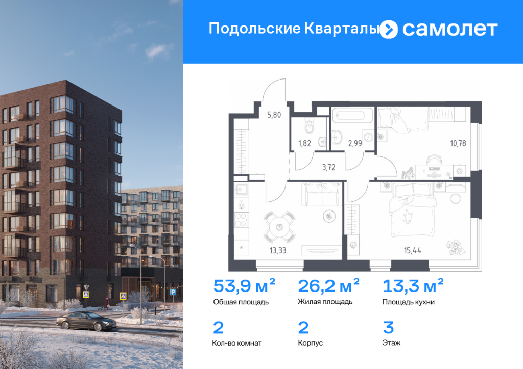 Строим кварталы для жизни с заботой о будущем. Предлагается 2-комнатная квартира комфорт-класса 53,88 кв.м в корпусе 2 на 3 этаже, в ЖК «Подольские Кварталы» Квартира без отделки. Доступность опции «отделка» и возможность комплектации мебелью и декором уточняйте у застройщика. Приобрести квартиру возможно по специальным акциям от застройщика, с текущими условиями акций можно ознакомиться в блоке «Акций». Цена динамическая и может отличаться, уточняйте актуальность у застройщика. «Подольские кварталы» — жилой комплекс в Новой Москве, рядом с Дубровицким лесом и рекой Десной. До станции МЦД-2 "Остафьево" - 5 минут на общественном транспорте, до станции МЦД-2 «Силикатная» — 8 минут на машине. Рядом — музей-заповедник «Остафьево», усадьбы Плещеево и Дубровицы. В квартале будут детский сад на 200 мест и учебно-воспитательный комплекс на 1 500 мест, в который войдут школа и детский сад. Первые этажи жилых корпусов займут квартиры, кафе, магазины и салоны красоты. Дворы-парки будут радовать жителей цветением и зеленью: здесь высадят липы, сосны, ели, клены и сирень. Плэйхаб станет местом встреч всех любителей активного отдыха: застройщик оборудует зоны тренажеров и воркаута, площадки для игр в настольный теннис, мяч, шахматы. Также появятся современные игровые площадки для детей. Для автовладельцев предусмотрен многоуровневый паркинг. В проекте — монолитные дома высотой от 9 до 12 этажей. Теплые оттенки фасадов соответствуют дизайн-коду «Янтарный берег». Фасады облицованы ложковой кирпичной кладкой.