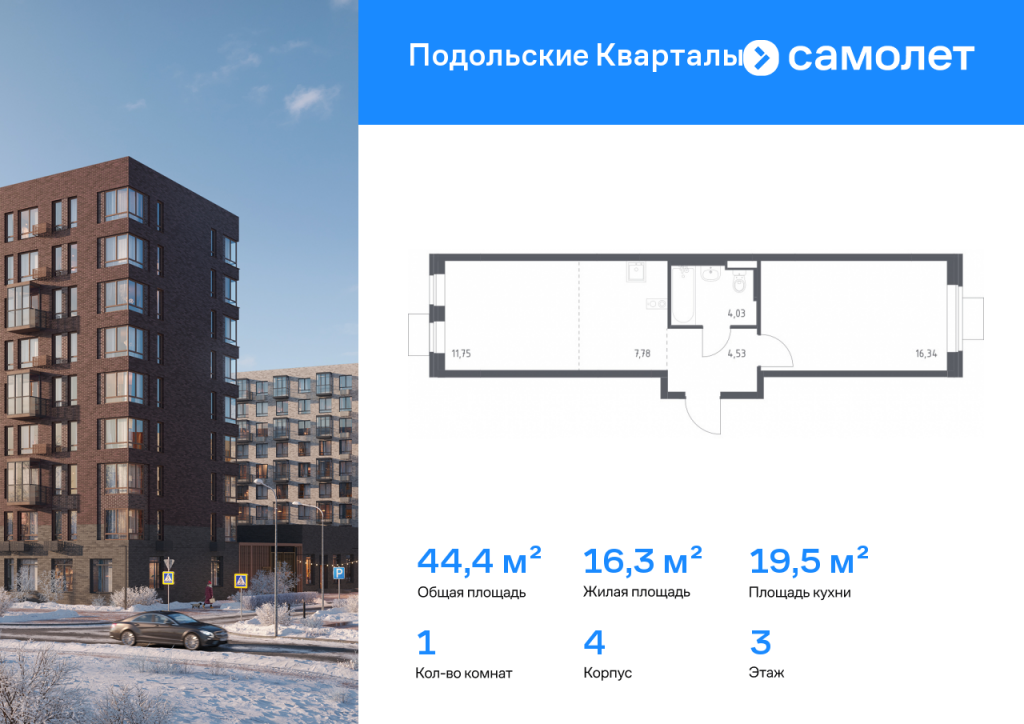 Строим кварталы для жизни с заботой о будущем. Предлагается 1-комнатная квартира комфорт-класса 44,43 кв.м в корпусе 4 на 3 этаже, в ЖК «Подольские Кварталы» Квартира без отделки. Доступность опции «отделка» и возможность комплектации мебелью и декором уточняйте у застройщика. Приобрести квартиру возможно по специальным акциям от застройщика, с текущими условиями акций можно ознакомиться в блоке «Акций». Цена динамическая и может отличаться, уточняйте актуальность у застройщика. «Подольские кварталы» — жилой комплекс в Новой Москве, рядом с Дубровицким лесом и рекой Десной. До станции МЦД-2 "Остафьево" - 5 минут на общественном транспорте, до станции МЦД-2 «Силикатная» — 8 минут на машине. Рядом — музей-заповедник «Остафьево», усадьбы Плещеево и Дубровицы. В квартале будут детский сад на 200 мест и учебно-воспитательный комплекс на 1 500 мест, в который войдут школа и детский сад. Первые этажи жилых корпусов займут квартиры, кафе, магазины и салоны красоты. Дворы-парки будут радовать жителей цветением и зеленью: здесь высадят липы, сосны, ели, клены и сирень. Плэйхаб станет местом встреч всех любителей активного отдыха: застройщик оборудует зоны тренажеров и воркаута, площадки для игр в настольный теннис, мяч, шахматы. Также появятся современные игровые площадки для детей. Для автовладельцев предусмотрен многоуровневый паркинг. В проекте — монолитные дома высотой от 9 до 12 этажей. Теплые оттенки фасадов соответствуют дизайн-коду «Янтарный берег». Фасады облицованы ложковой кирпичной кладкой.