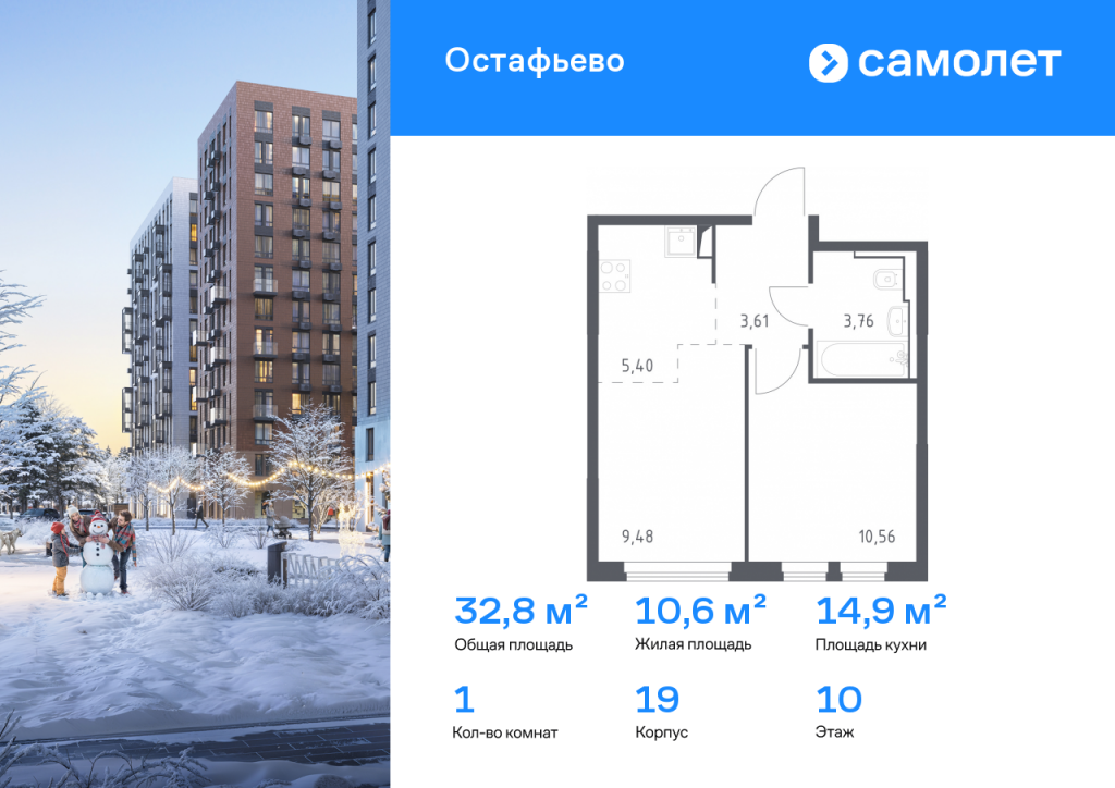 Строим кварталы для жизни с заботой о будущем. Предлагается 1-комнатная квартира комфорт-класса 32,81 кв.м в корпусе 19 на 10 этаже, в ЖК «Остафьево» Квартира без отделки. Доступность опции «отделка» и возможность комплектации мебелью и декором уточняйте у застройщика. Приобрести квартиру возможно по специальным акциям от застройщика, с текущими условиями акций можно ознакомиться в блоке «Акций». Цена динамическая и может отличаться, уточняйте актуальность у застройщика. «Остафьево» — масштабный жилой комплекс в Новой Москве, рядом с одноименным музеем-усадьбой и городским парком «Барыши». До станций МЦД «Щербинка» и «Остафьево» можно добраться на автомобиле за 5–7 минут. Часть домов уже сдана, на территории открыты две школы и три детских сада, а в будущем будет построена поликлиника, ТЦ, еще одна школа и три детских сада. Все необходимое рядом: на первых этажах домов работают магазины, аптеки и кафе. Дворы — приватные мини-парки без машин и посторонних. Кроме игровых площадок, для детей обустроили тематический плейхаб «Маяк». В будущем появятся плейхаб «Алиса в стране чудес», арт-объект «Тропа зеркал», а также большой ландшафтный парк. В квартале — монолитные дома комфортной высоты, от 10 этажей. Светлые фасады украшают кирпичные вставки в теплых природных оттенках.