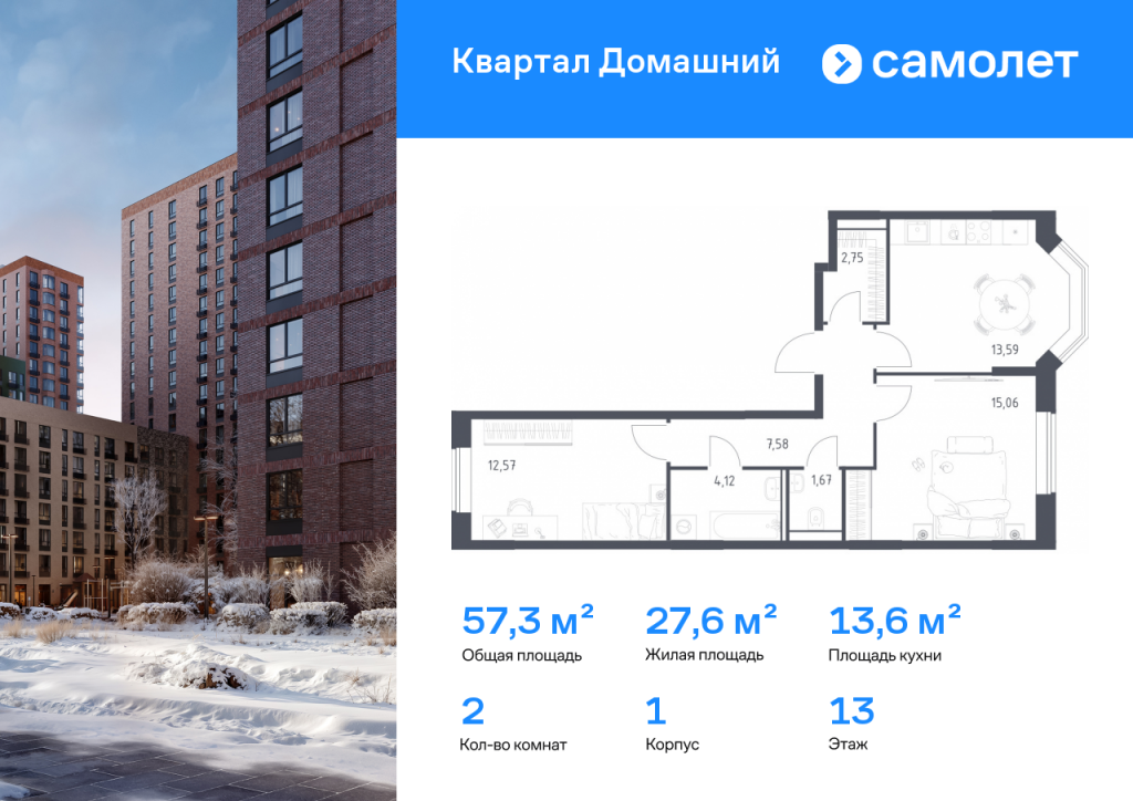 Строим кварталы для жизни с заботой о будущем. Предлагается 2-комнатная квартира комфорт-класса 57,34 кв.м в корпусе 1 на 13 этаже, в ЖК «Квартал Домашний» Квартира без отделки. Доступность опции «отделка» и возможность комплектации мебелью и декором уточняйте у застройщика. Приобрести квартиру возможно по специальным акциям от застройщика, с текущими условиями акций можно ознакомиться в блоке «Акций». Цена динамическая и может отличаться, уточняйте актуальность у застройщика. «Квартал Домашний» находится в Марьино — всего 7 минут пешком до МЦД-2 «Курьяново». Рядом с домом — набережная Москвы-реки. Внутренняя инфраструктура проекта продумана до мелочей: от супермаркетов до кафе и салонов красоты. В «Квартале Домашнем» можно выбирать свою высоту — в комплексе есть корпуса от 7 до 19 этажей. Среди планировочных решений — просторные кухни-гостиные, гардеробные, постирочные, лоджии и угловые окна. «Квартал Домашний» — это: 1. До станции МЦД-2 «Курьяново» — 7 минут пешком 2. До парка 850-летия Москвы — 5 минут пешком 3. До парка «Борисовские пруды» — 15 минут на машине 4. До музея-заповедника «Царицыно» — 20 минут на авто 5. Музей-заповедник «Коломенское» — для фотосессий и прогулок 6. Европейская архитектура с фасадами природных оттенков: песочного, серого, зеленого, терракотового 7. Школа со стадионом, 2 детских сада — на территории квартала 8. Магазины, кафе и салоны красоты на первых этажах домов 9. Приватные дворы без машин 10. Подземный паркинг с местами для электрокаров и индивидуальные кладовые 11. Спортивные и игровые площадки