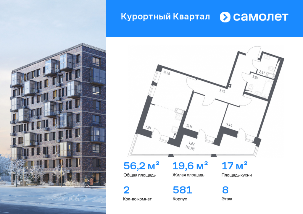 Строим кварталы для жизни с заботой о будущем. Предлагается 2-комнатная квартира комфорт-класса 56,2 кв.м в корпусе 581 на 8 этаже, в ЖК «Курортный Квартал» Квартира с чистовой отделкой. Доступность дополнительных опций уточняйте у застройщика. Приобрести квартиру возможно по специальным акциям от застройщика, с текущими условиями акций можно ознакомиться в блоке «Акций». Цена динамическая и может отличаться, уточняйте актуальность у застройщика. Чтобы воплотить ваши мечты о жизни на курорте, мы построили проект комфорт-класса в 20 минутах от Финского залива. «Курортный Квартал» расположен в престижном районе поселка Песочный, всего в 25 минутах от центра Петербурга и 20 минутах до метро. На территории будет школа на 1100 мест с бассейном и детский сад на 110 мест. На первых этажах откроются кафе, магазины и пекарни. Рядом — спортивные секции и медицинские центры. В 3 минутах от дома — Курортный лесопарк для пикников и спорта на свежем воздухе. В выходные можно загорать на пляжах Финского залива или наблюдать за цаплями на Сестрорецком разливе. Корпуса высотой 7–10 этажей с фасадами в природных оттенках. Приватные дворы-парки без машин — с тренажерами и детскими площадками. Есть зеленый бульвар и сквер для отдыха. Предусмотрен открытый паркинг. В сквозных парадных — безбарьерная среда и помещения для хранения колясок. Все квартиры — с готовой отделкой, поэтому вам не придется тратить время и силы на ремонт.
