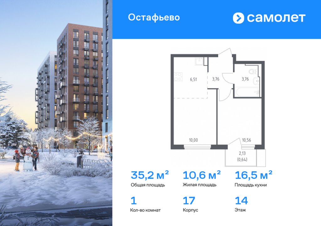 Строим кварталы для жизни с заботой о будущем. Предлагается 1-комнатная квартира комфорт-класса 35,23 кв.м в корпусе 17 на 14 этаже, в ЖК «Остафьево» Квартира с предчистовой отделкой. Доступность дополнительных опций уточняйте у застройщика. Приобрести квартиру возможно по специальным акциям от застройщика, с текущими условиями акций можно ознакомиться в блоке «Акций». Цена динамическая и может отличаться, уточняйте актуальность у застройщика. «Остафьево» — масштабный жилой комплекс в Новой Москве, рядом с одноименным музеем-усадьбой и городским парком «Барыши». До станций МЦД «Щербинка» и «Остафьево» можно добраться на автомобиле за 5–7 минут. Часть домов уже сдана, на территории открыты две школы и три детских сада, а в будущем будет построена поликлиника, ТЦ, еще одна школа и три детских сада. Все необходимое рядом: на первых этажах домов работают магазины, аптеки и кафе. Дворы — приватные мини-парки без машин и посторонних. Кроме игровых площадок, для детей обустроили тематический плейхаб «Маяк». В будущем появятся плейхаб «Алиса в стране чудес», арт-объект «Тропа зеркал», а также большой ландшафтный парк. В квартале — монолитные дома комфортной высоты, от 10 этажей. Светлые фасады украшают кирпичные вставки в теплых природных оттенках.