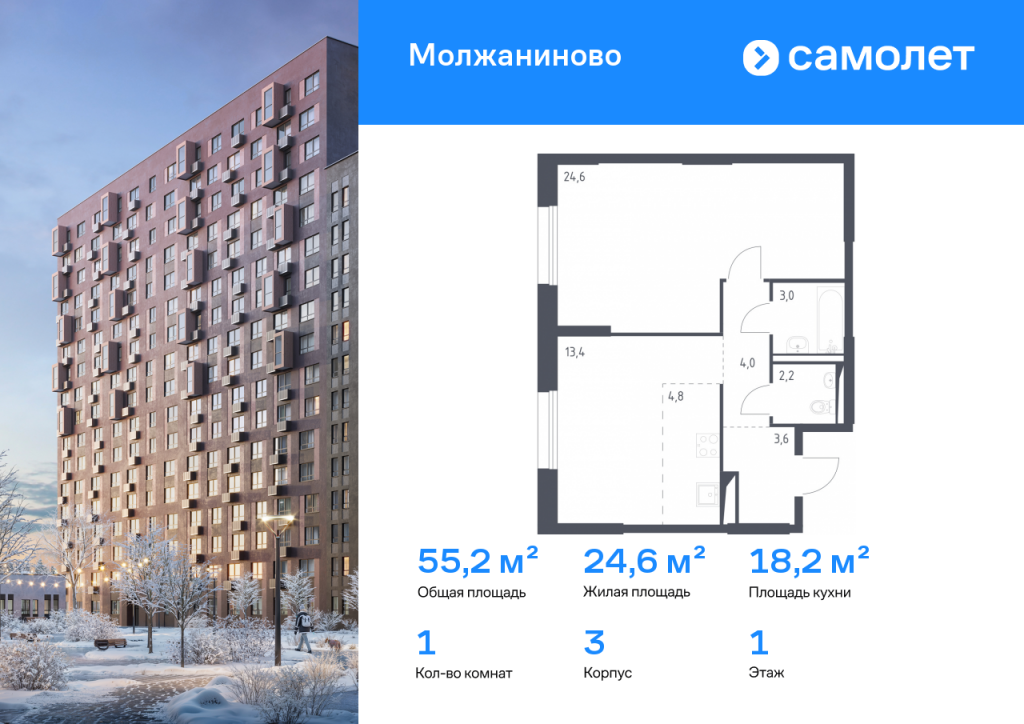 Строим кварталы для жизни с заботой о будущем. Предлагается 1-комнатная квартира комфорт-класса 55,2 кв.м в корпусе 3 на 1 этаже, в ЖК «Молжаниново» Квартира с чистовой отделкой. Доступность дополнительных опций уточняйте у застройщика. Приобрести квартиру возможно по специальным акциям от застройщика, с текущими условиями акций можно ознакомиться в блоке «Акций». Цена динамическая и может отличаться, уточняйте актуальность у застройщика. Жилой комплекс «Молжаниново» — это место, где каждый маршрут продуман так, чтобы вы проводили больше времени с близкими, а не в дороге. Ставьте паруса в канале имени Москвы, устраивайте пикники в Химкинском лесу или ищите редких птиц в Захарьинской пойме. Жилой комплекс сочетает в себе комфорт городской жизни с преимуществами природы. С одной стороны — московская регистрация, собственная инфраструктура, благоустроенные дворы с детскими площадками и зонами отдыха. С другой — ручей и пруд прямо на территории, а также много леса вокруг.