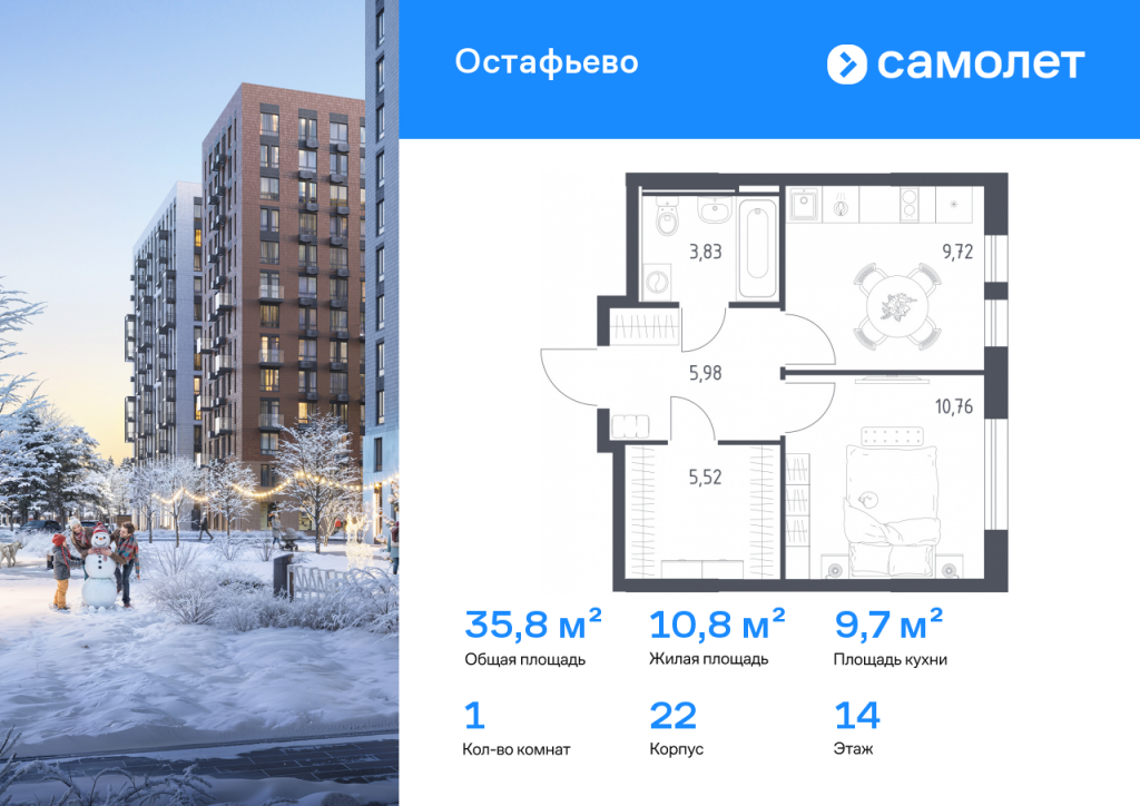 Строим кварталы для жизни с заботой о будущем. Предлагается 1-комнатная квартира комфорт-класса 35,81 кв.м в корпусе 22 на 14 этаже, в ЖК «Остафьево» Квартира без отделки. Доступность опции «отделка» и возможность комплектации мебелью и декором уточняйте у застройщика. Приобрести квартиру возможно по специальным акциям от застройщика, с текущими условиями акций можно ознакомиться в блоке «Акций». Цена динамическая и может отличаться, уточняйте актуальность у застройщика. «Остафьево» — масштабный жилой комплекс в Новой Москве, рядом с одноименным музеем-усадьбой и городским парком «Барыши». До станций МЦД «Щербинка» и «Остафьево» можно добраться на автомобиле за 5–7 минут. Часть домов уже сдана, на территории открыты две школы и три детских сада, а в будущем будет построена поликлиника, ТЦ, еще одна школа и три детских сада. Все необходимое рядом: на первых этажах домов работают магазины, аптеки и кафе. Дворы — приватные мини-парки без машин и посторонних. Кроме игровых площадок, для детей обустроили тематический плейхаб «Маяк». В будущем появятся плейхаб «Алиса в стране чудес», арт-объект «Тропа зеркал», а также большой ландшафтный парк. В квартале — монолитные дома комфортной высоты, от 10 этажей. Светлые фасады украшают кирпичные вставки в теплых природных оттенках.