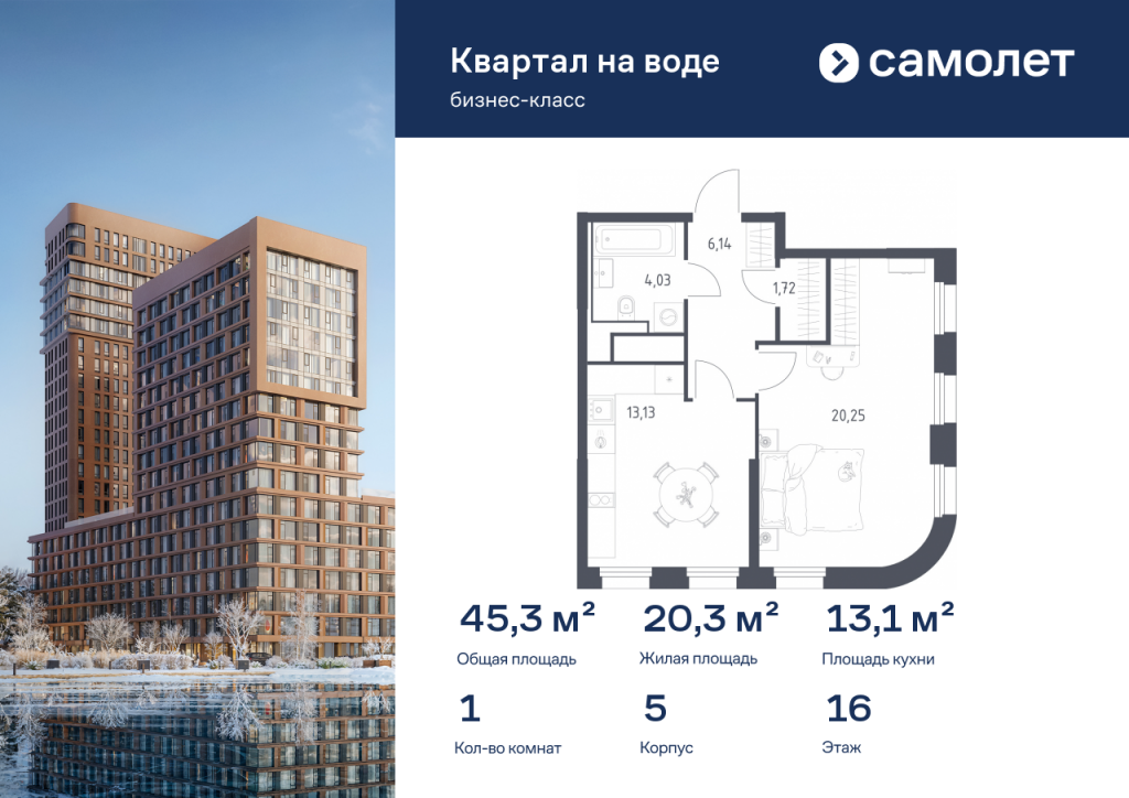 Строим кварталы для жизни с заботой о будущем. Предлагается 1-комнатная квартира бизнес-класса 45,27 кв.м в корпусе 5 на 16 этаже, в ЖК «Квартал на воде» Квартира без отделки. Доступность опции «отделка» и возможность комплектации мебелью и декором уточняйте у застройщика. Приобрести квартиру возможно по специальным акциям от застройщика, с текущими условиями акций можно ознакомиться в блоке «Акций». Цена динамическая и может отличаться, уточняйте актуальность у застройщика. «Квартал на воде» — жилой комплекс бизнес-класса на берегу Москвы-реки, в районе Печатники. Включает дома переменной этажности, собственную благоустроенную набережную и приватные дворы-парки. Проект — пример минималистичной архитектуры от бюро Kleinewelt Architekten. До МЦД-2 «Перерва» — 5 минут пешком. В конце 2027 года рядом откроется станция метро «Курьяново».