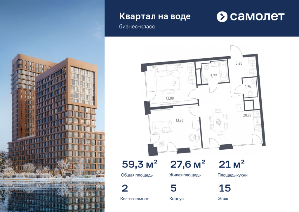 Строим кварталы для жизни с заботой о будущем. Предлагается 2-комнатная квартира бизнес-класса 59,32 кв.м в корпусе 5 на 15 этаже, в ЖК «Квартал на воде» Квартира без отделки. Доступность опции «отделка» и возможность комплектации мебелью и декором уточняйте у застройщика. Приобрести квартиру возможно по специальным акциям от застройщика, с текущими условиями акций можно ознакомиться в блоке «Акций». Цена динамическая и может отличаться, уточняйте актуальность у застройщика. «Квартал на воде» — жилой комплекс бизнес-класса на берегу Москвы-реки, в районе Печатники. Включает дома переменной этажности, собственную благоустроенную набережную и приватные дворы-парки. Проект — пример минималистичной архитектуры от бюро Kleinewelt Architekten. До МЦД-2 «Перерва» — 5 минут пешком. В конце 2027 года рядом откроется станция метро «Курьяново».