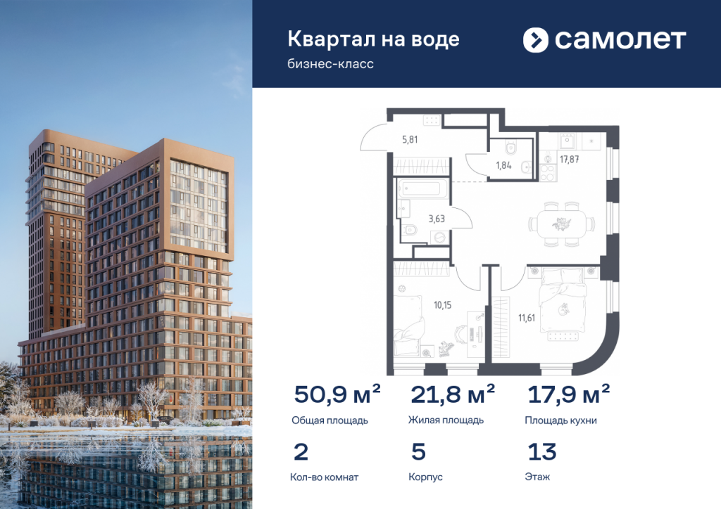 Строим кварталы для жизни с заботой о будущем. Предлагается 2-комнатная квартира бизнес-класса 50,91 кв.м в корпусе 5 на 13 этаже, в ЖК «Квартал на воде» Квартира без отделки. Доступность опции «отделка» и возможность комплектации мебелью и декором уточняйте у застройщика. Приобрести квартиру возможно по специальным акциям от застройщика, с текущими условиями акций можно ознакомиться в блоке «Акций». Цена динамическая и может отличаться, уточняйте актуальность у застройщика. «Квартал на воде» — жилой комплекс бизнес-класса на берегу Москвы-реки, в районе Печатники. Включает дома переменной этажности, собственную благоустроенную набережную и приватные дворы-парки. Проект — пример минималистичной архитектуры от бюро Kleinewelt Architekten. До МЦД-2 «Перерва» — 5 минут пешком. В конце 2027 года рядом откроется станция метро «Курьяново».
