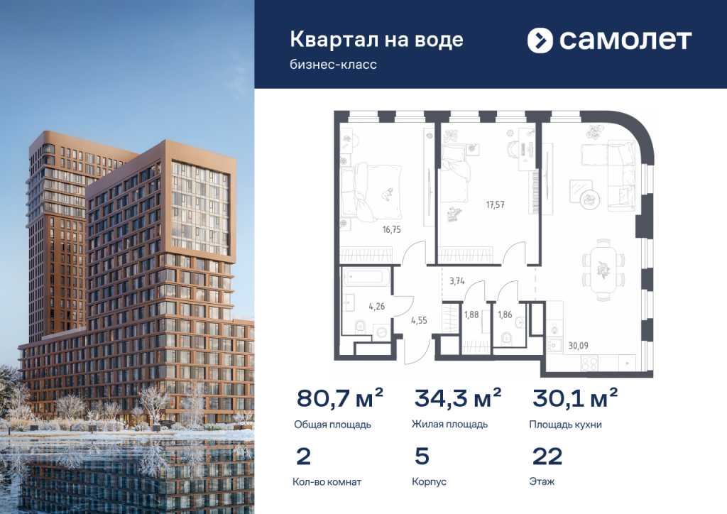 Строим кварталы для жизни с заботой о будущем. Предлагается 2-комнатная квартира бизнес-класса 80,7 кв.м в корпусе 5 на 22 этаже, в ЖК «Квартал на воде» Квартира без отделки. Доступность опции «отделка» и возможность комплектации мебелью и декором уточняйте у застройщика. Приобрести квартиру возможно по специальным акциям от застройщика, с текущими условиями акций можно ознакомиться в блоке «Акций». Цена динамическая и может отличаться, уточняйте актуальность у застройщика. «Квартал на воде» — жилой комплекс бизнес-класса на берегу Москвы-реки, в районе Печатники. Включает дома переменной этажности, собственную благоустроенную набережную и приватные дворы-парки. Проект — пример минималистичной архитектуры от бюро Kleinewelt Architekten. До МЦД-2 «Перерва» — 5 минут пешком. В конце 2027 года рядом откроется станция метро «Курьяново».