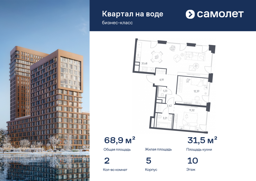 Строим кварталы для жизни с заботой о будущем. Предлагается 2-комнатная квартира бизнес-класса 68,94 кв.м в корпусе 5 на 10 этаже, в ЖК «Квартал на воде» Квартира без отделки. Доступность опции «отделка» и возможность комплектации мебелью и декором уточняйте у застройщика. Приобрести квартиру возможно по специальным акциям от застройщика, с текущими условиями акций можно ознакомиться в блоке «Акций». Цена динамическая и может отличаться, уточняйте актуальность у застройщика. «Квартал на воде» — жилой комплекс бизнес-класса на берегу Москвы-реки, в районе Печатники. Включает дома переменной этажности, собственную благоустроенную набережную и приватные дворы-парки. Проект — пример минималистичной архитектуры от бюро Kleinewelt Architekten. До МЦД-2 «Перерва» — 5 минут пешком. В конце 2027 года рядом откроется станция метро «Курьяново».