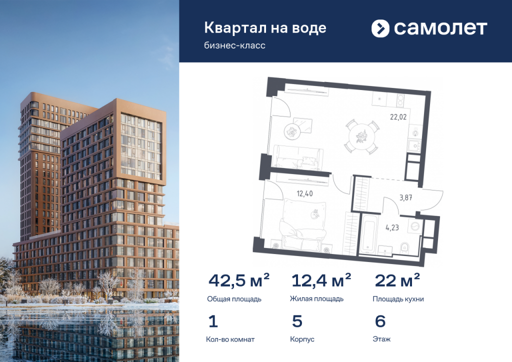 Строим кварталы для жизни с заботой о будущем. Предлагается 1-комнатная квартира бизнес-класса 42,52 кв.м в корпусе 5 на 6 этаже, в ЖК «Квартал на воде» Квартира без отделки. Доступность опции «отделка» и возможность комплектации мебелью и декором уточняйте у застройщика. Приобрести квартиру возможно по специальным акциям от застройщика, с текущими условиями акций можно ознакомиться в блоке «Акций». Цена динамическая и может отличаться, уточняйте актуальность у застройщика. «Квартал на воде» — жилой комплекс бизнес-класса на берегу Москвы-реки, в районе Печатники. Включает дома переменной этажности, собственную благоустроенную набережную и приватные дворы-парки. Проект — пример минималистичной архитектуры от бюро Kleinewelt Architekten. До МЦД-2 «Перерва» — 5 минут пешком. В конце 2027 года рядом откроется станция метро «Курьяново».