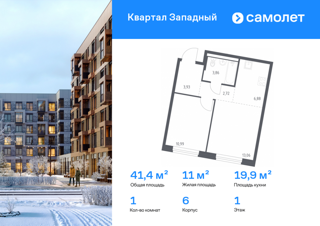Строим кварталы для жизни с заботой о будущем. Предлагается 1-комнатная квартира комфорт-класса 41,44 кв.м в корпусе 6 на 1 этаже, в ЖК «Квартал Западный» Квартира без отделки. Доступность опции «отделка» и возможность комплектации мебелью и декором уточняйте у застройщика. Приобрести квартиру возможно по специальным акциям от застройщика, с текущими условиями акций можно ознакомиться в блоке «Акций». Цена динамическая и может отличаться, уточняйте актуальность у застройщика. Жилой комплекс в окружении лесопарков и рядом с рекой. До станции МЦД-4 «Санино» можно дойти пешком за 7 минут, а на территории проекта появится транспортно-пересадочный узел с торговым центром. Для жителей построят школу, 2 детсада, в одном из которых будут развивающие кабинеты-трансформеры. Дворы — тихое зеленое пространство без машин. В проекте появится собственный ландшафтный парк с благоустроенной набережной и центральная площадь, на которой будут проводиться различные мероприятия. Высота домов — от 5 до 15 этажей. Фасады выполняют в естественных оттенках, в соответствии с дизайн-кодом «Полевой луг». У каждой секции — свое цветовое решение. Белый цвет верхних этажей добавляет застройке легкости. Фасады облицованы клинкерным глазурованным кирпичом, который используют в проектах бизнес-класса.